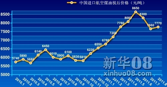 2011年8月中国进口航空煤油税后价环比涨1.4%