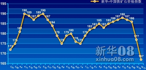 核心提示:“新华—中国铁矿石价格指数”显示,截至10月17日,新华铁矿石价格指数环比降10个单位至167。