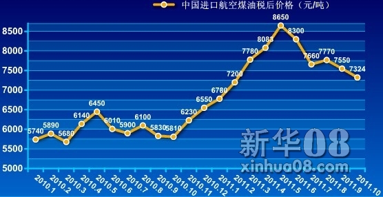 新华08图表:中国进口航空煤油税后价格走势图 新华08网站 王婧 制表