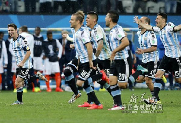 闯入决赛 阿根廷队球员在赛后庆祝胜利