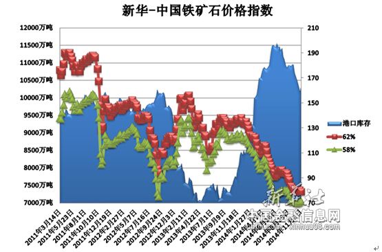 北京(CNFIN.COM/XINHUA08.COM)--“新华—中国铁矿石价格指数”显示,截至11月3日,中国港口铁矿石库存(沿海33港)为10344万吨,较上一统计周期(10月21日—10月27日,下同)增加147万吨,环比上涨1.44%。中国进口品位62%的铁矿石价格指数为79,较上一统计周期下降1个单位;58%品位的铁矿石价格指数为71,与上一统计周期持平。