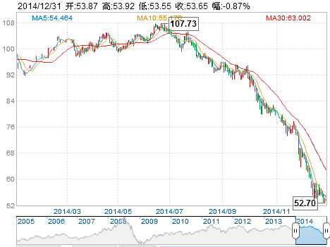 作为2014年金融市场最“熊”品种之一,国际油价自6月站上年内高点后便开启了断崖式下跌模式。12月以来,纽约油价和布伦特油价双双跌破每桶60美元大关,刷新五年半新低。纽约期货原油更是一度下探至每桶53美元左右,较年内高点107美元近腰斩;伦敦布伦特原油期货同样疲软,最低于每桶57美元左右徘徊,而年内高点达到每桶115美元左右。