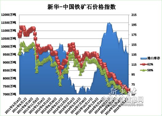北京(CNFIN.COM / XINHUA08.COM)--“新华—中国铁矿石价格指数”显示,截至3月2日,中国港口铁矿石库存(沿海33港)为9654万吨,较上一统计周期(2月10日—2月16日,下同)增加84万吨,环比上涨0.88%。中国进口品位62%的铁矿石价格指数为64,与上一统计周期持平;58%品位的铁矿石价格指数为54,同样与上一统计周期持平。