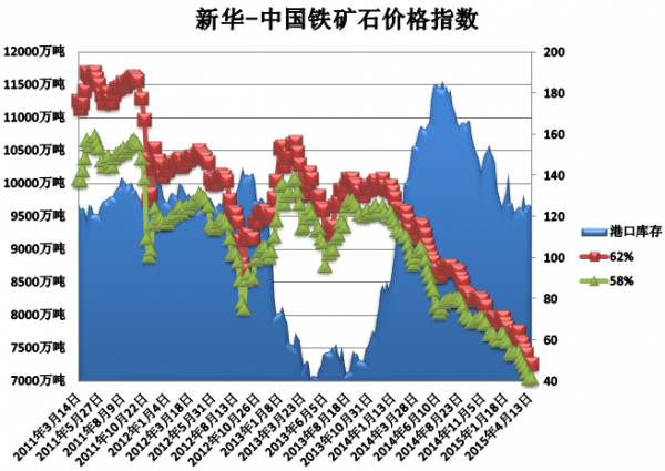 北京(CNFIN.COM / XINHUA08.COM)--“新华—中国铁矿石价格指数”显示,截至4月13日,中国港口铁矿石库存(沿海33港)为9597万吨,较上一统计周期(3月31日—4月6日,下同)减少86万吨,环比下降0.89%。中国进口品位62%的铁矿石价格指数为48,与上一统计周期持平;58%品位的铁矿石价格指数为41,同样与上一统计周期持平。