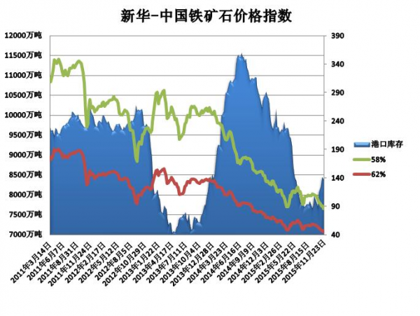北京(CNFIN.COM / XINHUA08.COM)--“新华—中国铁矿石价格指数”显示,截至11月23日,中国港口铁矿石库存(沿海33港)为8342万吨,较上一统计周期(11月10日至11月16日)减少61万吨,环比减少0.81%。中国进口品位62%的铁矿石价格指数为45,较上一统计周期下降2个单位;58%品位的铁矿石价格指数为41,同样较上一统计周期下降2个单位。