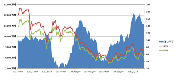 中国金融信息网(记者高波 杨苜)“新华—中国铁矿石价格指数”显示,截至10月30日中国港口(沿海33港) 铁矿石库存为11368万吨,较上一统计周期(10月17日至10月23日,下同)增长50万吨,环比上升0.44%。中国进口品位62%的铁矿石价格指数为59,较上一统计周期下降1个单位;58%品位的铁矿石价格指数为49,同样较上一统计周期下降1个单位。