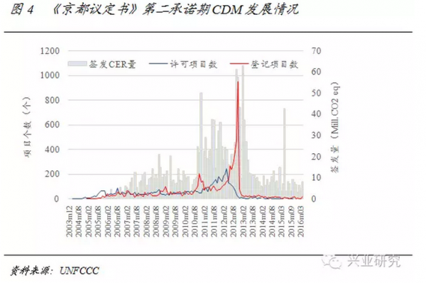 按计划《京都议定书》第一承诺期于2012年底到期。由于各国争执不下,2012年12月多哈气候大会通过“多哈修正案”,设定了附件一国家2020年前的量化减排目标,并确定于2013年(比预计推迟一年)开始执行。然而美国继续不合作,以及日本、俄罗斯和加拿大先后表示退出,加之第一承诺期后对没有达成减排目标的缔约方的惩罚形同虚设,严重打击了各方对第二承诺期的积极性,“议定书”实际约束力大幅下降。尽管“多哈修正案”进一步收紧了附件一国家量化减排目标,但是对CDM项目的需求却在不断下降。