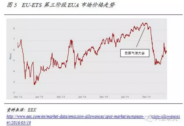 欧盟长期以来始终是应对全球气候变化的积极倡导者,然而在第二承诺期为其减排目标附加了一个条件:在其他发达国家做出与欧盟类似的减排承诺(指可量化的绝对量减排目标,且减排力度相当),且发展中国家也做出适当贡献时,承诺到2020年相对于1990年减排30%,否则只承诺减排20%。EU-ETS的第三阶段在时间上与“议定书”第二承诺期一致(2013年1月1日至2020年12月31日),从配额总量设置情况看(参见前文表2),EU-ETS第三阶段的减排目标设定为20%,即“议定书”第二阶段无条件承诺的减排幅度。由于EU-ETS第三阶段配额总量供应较紧,同时配额的拍卖也为市场提供了有效的价格参考,另外欧盟委员会限制了CER与VER的使用比例,导致第三阶段价格并没有出现第一阶段那样的大幅波动。但由于经济总体低迷,加之欧盟在《京都议定书》第二承诺期的减排目标尚不明确,给市场价格带来了一定的不确定性。这也解释了在2015年12月巴黎气候大会之后,由于《巴黎协议》没能达成量化减排目标,导致EUA价格大幅下跌。