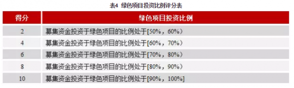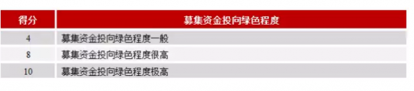 鹏元认为,对于监管机构目录内的绿色项目,尽管都是环境友好型的,但也可进一步细分为主动型环境友好项目和被动型环境友好项目,其绿色程度是有差别的。被动型环境友好项目主要是对已有的、对环境不利的因素进行整改、防治,鹏元将这类项目分类为绿色程度一般或很高。具体而言,煤炭清洁利用项目、尾矿、伴生矿再开发及综合利用项目、清洁燃油项目等,考虑到其行业本身具有高污染、高环境风险的特征,鹏元将其分类为绿色程度一般的项目;其他被动型环境友好项目我们分类为绿色程度很高。主动型环境友好项目,是相对于被动型环境友好项目而言的,例如水力发电、风力发电、太阳能光伏发电、太阳能热利用等新能源开发利用类项目,鹏元将主动型环境友好项目分类为绿色程度很高或极高。在评分时,募集资金投向绿色程度一般、很高、极高分别对应的得分分别为“4”、“8”和“10”分。