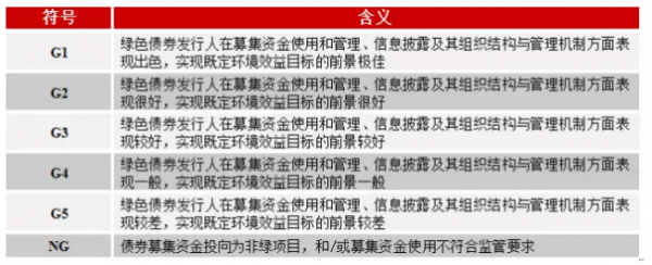 鹏元将绿色债券的绿色等级设置为五级,等级符号分别为:G1、G2、G3、G4、G5,反映了绿色债券发行人在募集资金使用和管理、信息披露及其组织结构与管理机制方面的综合表现,及由此实现既定环境效益目标的前景。同时,对于债券募集资金投向为非绿项目,和/或募集资金使用不符合监管要求的,则将其认定为“非绿”,用“NG”表示。绿色认证和评估等级符号及含义如下: