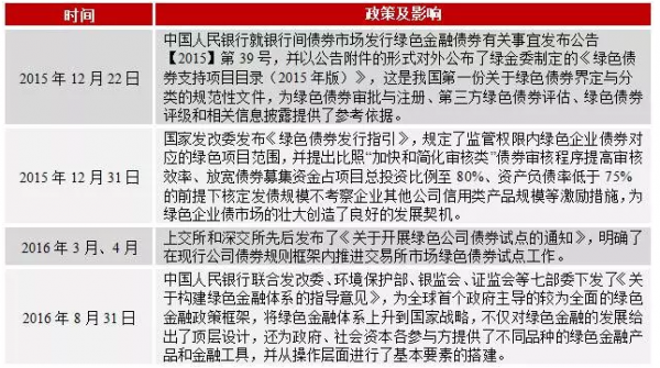 面对如火如荼的国际绿色债券市场,我国一系列推动绿色债券市场发展的政策也逐步落地。2015年4月,中国金融学会绿色金融专业委员会(以下简称“绿金委”)成立,其主要职责是推动绿色金融产品创新和落地,并负责国内绿色债券政策指引的研究;2015年9月21日,中共中央、国务院发布的《生态文明体制改革总体方案》中首次明确了建立我国绿色金融体系的顶层设计,并将发展绿色债券市场作为其中的一项重要内容。随着“绿色”在我国顶层政策脉络中重要程度的不断上升,中国人民银行、国家发改委、证监会等监管部门及上交所、深交所等交易场所也陆续推出相关利好政策,为国内绿色债券的发展壮大提供了良好的制度保障(见表1)。