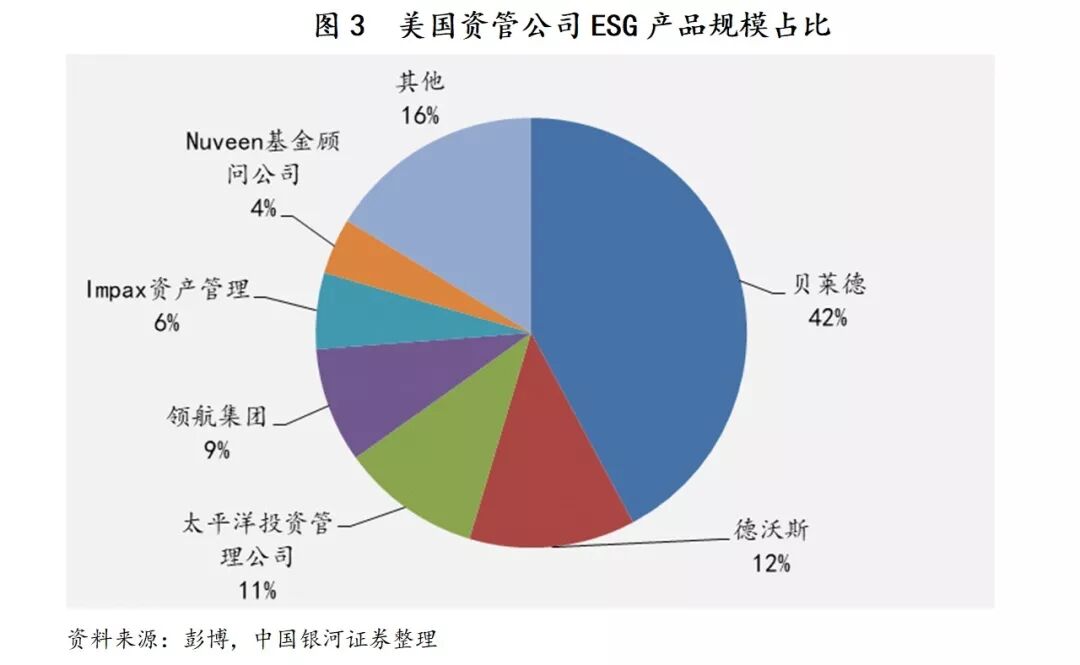 根据我们的整理和统计,美国共有79个ESG基金产品,基金规模合计156.87亿美元,其中贝莱德占比42.4%、德沃斯为12.5%、太平洋投资管理公司为10.5%、领航集团为9%、Impax资产管理公司为5.7%、Nuveen基金顾问公司为4.2%,如图3所示。在资产配置中,81.6%的资产侧重股权投资,15.9%的资产侧重固定收益证券投资,2%侧重货币投资。