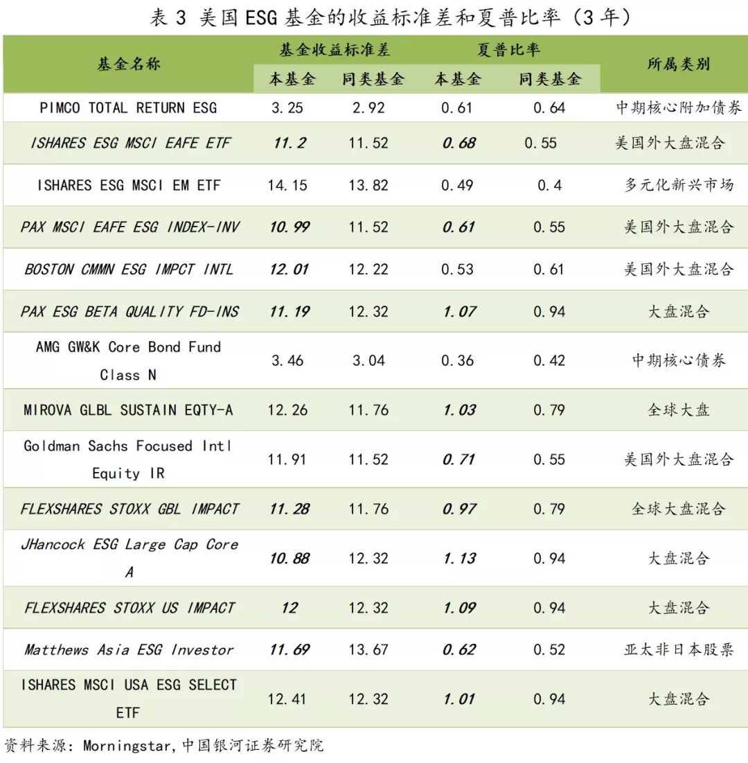 多数采用ESG投资策略的基金可以获得比同类基金较高的夏普比率,同时收益较为稳定。截至2019年10月底,79支中管理资金规模超过5,000万美元的ESG基金共有43支,其中14只基金有可比基金类别。10只基金的夏普比率高于同期同类别基金,8只基金的收益标准差小于同类基金,如表3所示。