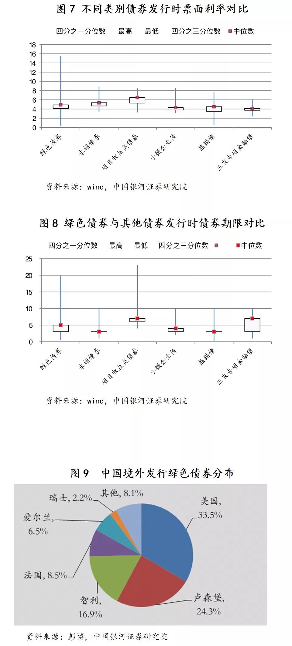 截至2019年11月底,中国境内共发行人民币绿色债券共有438支,合计发行总额4906.7亿元人民币。与其他债券相比,绿色债券发行时的票面利率范围广,其中位数高于小微企业债和专项金融债,比永续债券和项目收益类债券低,如图7所示;绿色债券的期限相对较长,仅短于项目收益类债券和三农专项债券,如图8所示。境外共发行49支绿色债券,其中,包含14支人民币绿色债券,合计993亿元;12支欧元绿色债券,合计69亿欧元;21支美元绿色债券,合计132.5亿美元;1支港元绿色债券,26亿港元;1支日元绿色债券,发行规模300亿日元。中国绿色债券境外主要持有占比最多的是美国(33.5%),其次是卢森堡(24.3%)、智利(16.9%)、法国(8.5%)、爱尔兰(6.5%)等,如图9所示。
