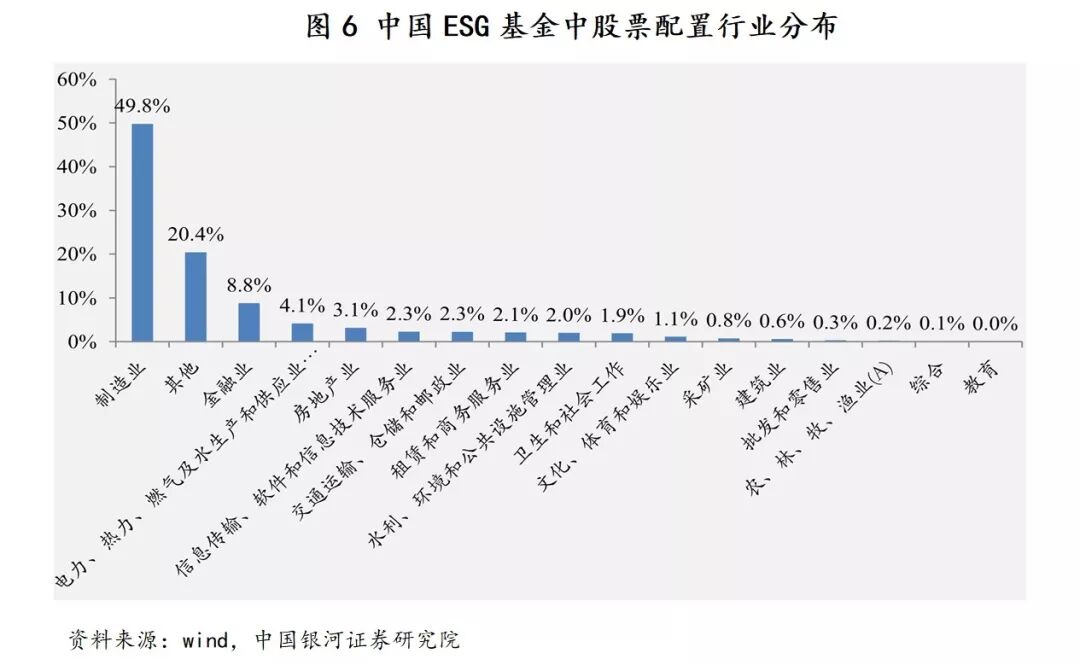 中国ESG基金的重仓股主要分布在制造业(49.8%)、金融业(8.8%)、热力燃气及水生产和供应业(4.1%)、房地产业(3.1%),其余包括交通运输仓储和邮政业、租赁和商务服务业、水利环境和公共设施管理业、卫生和社会工作业等,反映中国产业结构以第二产业为主的特性,同时关注第三产业的金融行业,如图6所示。