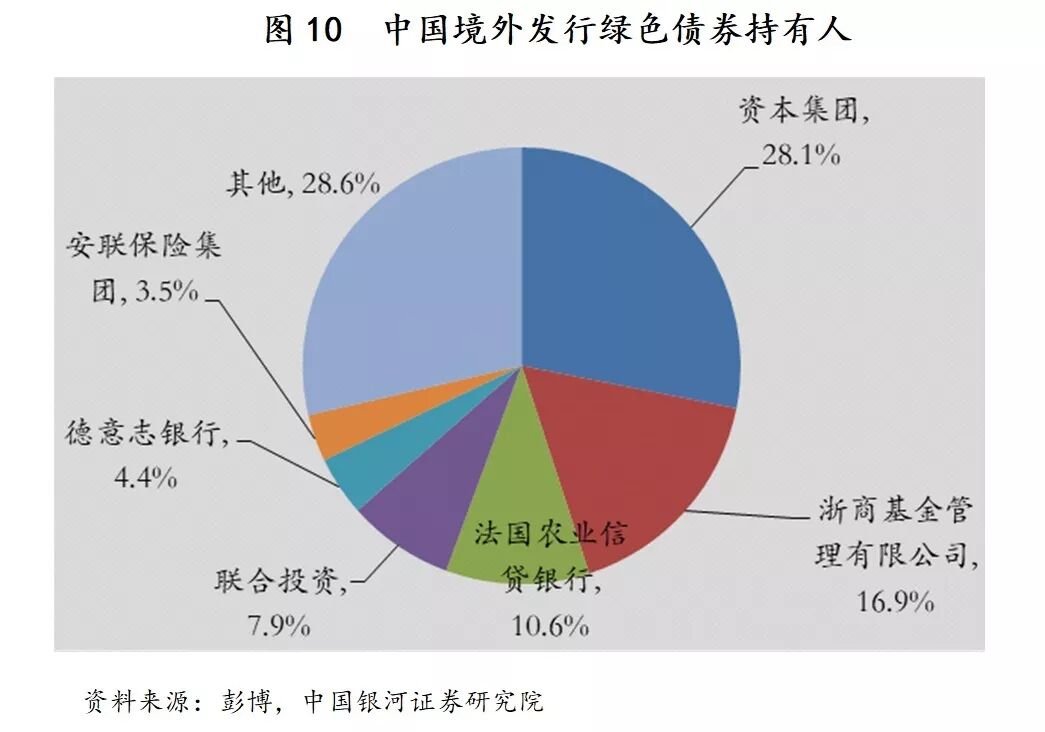 美国资本集团是中国境外绿色债券的最大持有人,持有债券占比为28.1%,其次是浙商基金管理有限公司、法国农业信贷银行、联合投资、德意志银行、安联保险集团等,如图10所示。