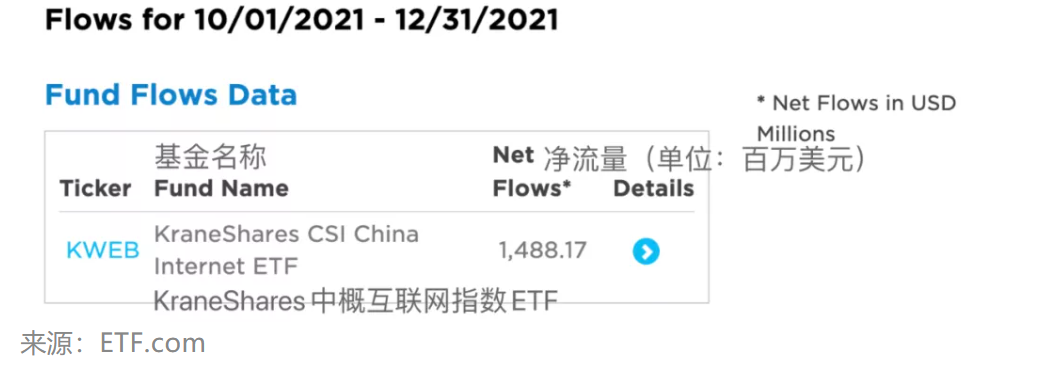 近一年以来,KWEB持续下跌,但依旧难浇灭资金的抄底热情。ETF资金追踪网站ETF.com的数据显示,2021年四季度,KWEB吸金超14.88亿美元。这意味着在抄底中概互联网这件事上,景林并不孤单。而资金流入至今仍未停止,在今年以来一个多月的时间内,KWEB已经获得超过10.25亿美元的净流入。