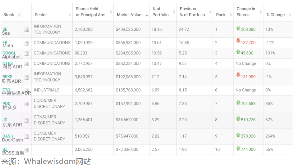 此外,景林的前十大美股持仓占其整体美股投资组合的81.45%,持仓十分集中。具体来看,截至2021年四季度末,其美股的第一大重仓股是被称为“东南亚小腾讯”的Sea。报告期内景林小幅加仓13%的仓位,共持有219万股,持仓市值4.90亿美元。排在第二位的是Meta,景林共持有109万股,市值3.67亿美元。四季度内,谷歌母公司Alphabet被景林大幅增持近5万股,增持幅度达101%,持仓市值达2.85亿美元,蹿升至第三大美股重仓股。网易ADR、贝壳ADR分别位列第四、第五,景林分别持有两家公司277万股、955万股,持仓市值分别为2.82亿美元、1.92亿美元。此外,其前十大美股重仓股还包括中通快递ADR、拼多多、京东ADR、DoorDash、BOSS直聘。