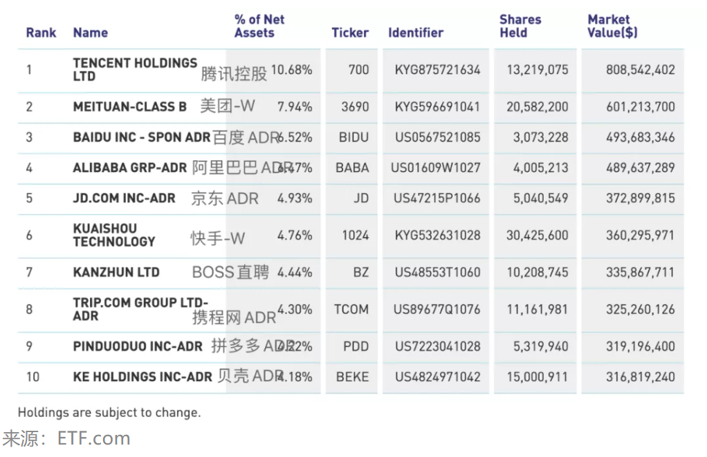 据了解,KWEB是中金公司旗下金瑞基金在美国发行的中国互联网指数ETF,规模约73亿美元,是目前美国市场上规模最大的中国股票ETF。前十大成分股依次为腾讯控股、美团-W、百度ADR、阿里巴巴ADR、京东ADR、快手-W、BOSS直聘、携程网ADR、拼多多ADR、贝壳ADR。