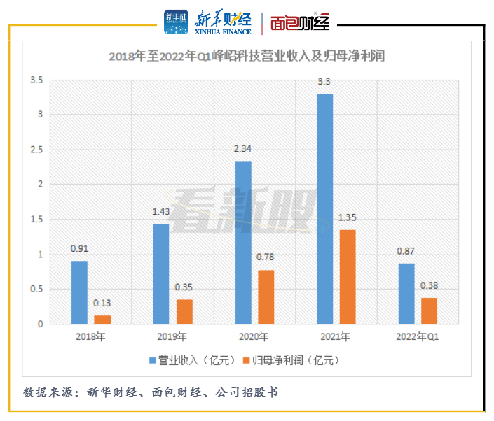 图1:2018年至2022年Q1峰岹科技营业收入及归母净利润