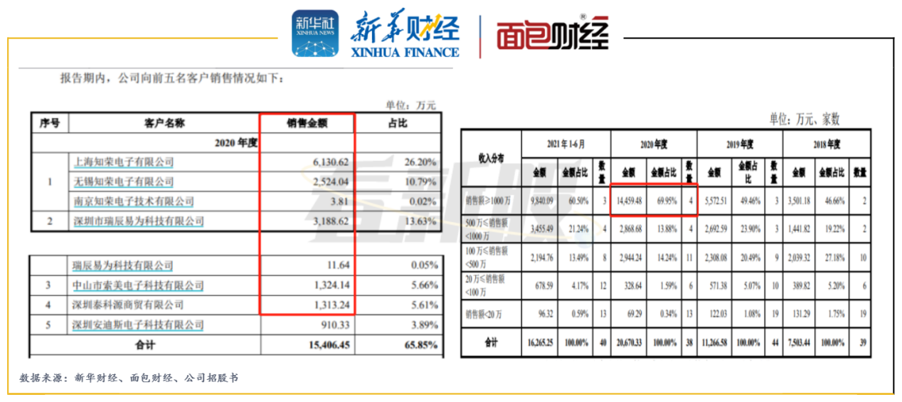 上交所首轮审核问询中还关注到公司主要客户知荣电子、瑞辰易为、索美电子等都为注册资本 100万左右或未实际缴纳注册资产的公司,注册资本与实际业务往来金额差距较大。问询函中要求公司对经销商的数量、经销收入规模等情况作出说明。