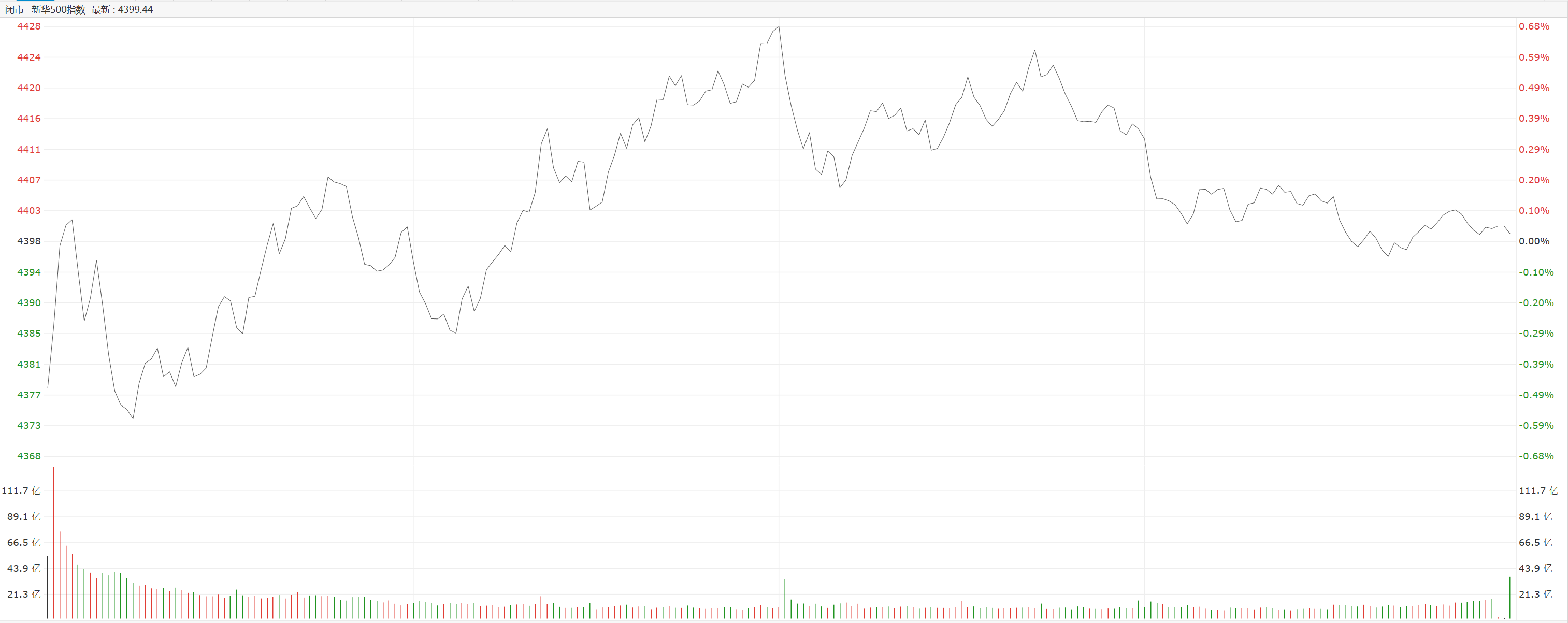 分时上看,新华500指数(989001)周四低开,开盘后快速翻红,此后指数震荡上行,上午收盘前涨幅扩大至0.6%以上。午后指数震荡回落,尾盘接近回吐全日涨幅,最终指数日线收带上影线的小阳线,实现日线四连涨。指数盘中最高触及4430.7点,最低触及4371.74点,成分股全天总成交3650亿元。