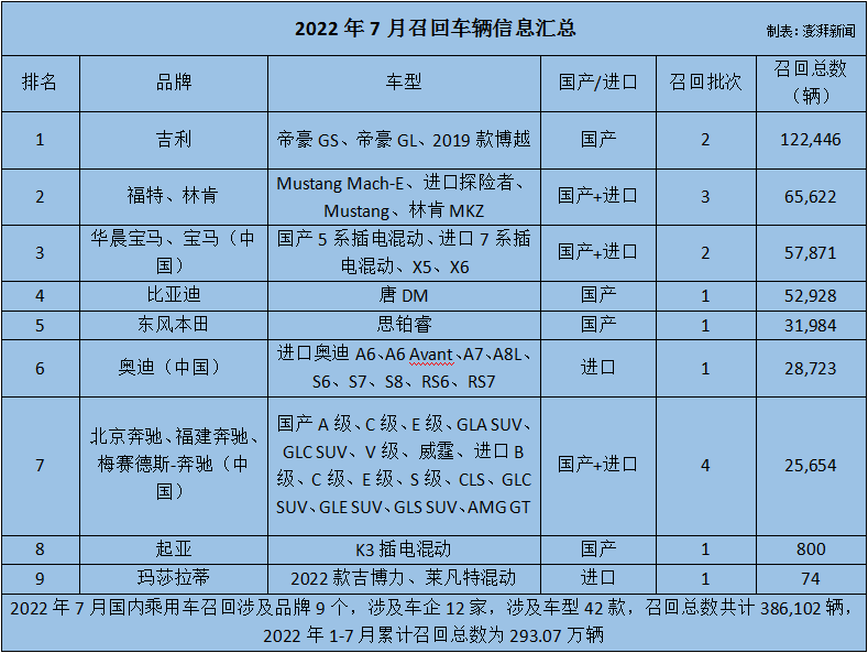 7月汽车召回逾38万辆:吉利居榜首 新能源车占比近三成