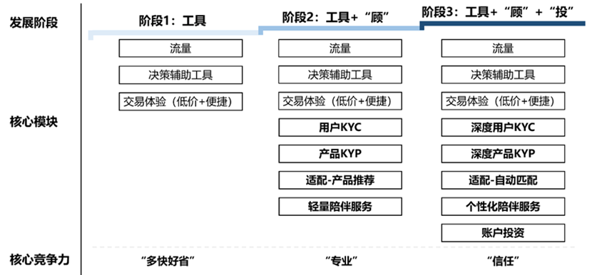 阶段三与阶段二在“顾”的方面,区别在哪里?市场可以把它们比作是“药店”和“医院”。在阶段一和阶段二,业务模式更像“药店”——摆上琳琅满目的药品,客户到药店来能非常便捷地买到自己想要的药品;当他迷茫的时候,药店的销售人员也有一些基础的医学知识,可以给他一些引导,但只是一个轻量的陪伴服务。阶段三更像“医院”,以治愈客户为目标。客户付了诊疗费,医院的初心不是卖药,而是要通过各种检查(KYC),根据客户的身体状况、利用医生的专业知识开出药方。之后需要护士去陪伴客户,督促其按时服药,按照医生的要求进行康复治疗。当发生副作用时,需要适时安抚客户坚持服药,宽慰他一定能康复。