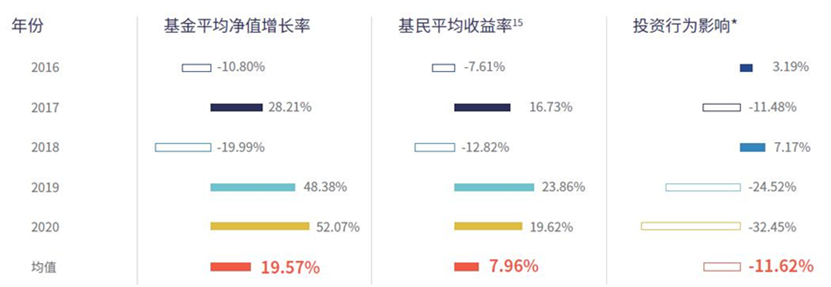 市场可以把基民的投资收益拆解为两部分,即产品收益+投资者行为收益。基民最终获得的投资收益无法匹配产品收益,往往是因为其投资行为不正确,提供了负贡献。数据上也证明了这一点。由景顺长城、富国、交银施罗德三家基金公司联合发布的《公募权益类基金投资者盈利洞察报告》显示,基民的投资行为常常贡献负收益,使得基民的平均收益率低于基金收益。例如,在2016年至2020年五年间,基金的平均净值增长率年度均值达到19.57%,而同期基民平均收益率年度均值只有7.96%。