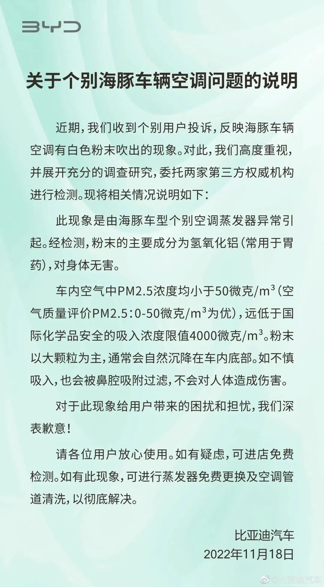 针对车主们的集体投诉,11月18日,比亚迪通过官方微博发文回应称,比亚迪海豚喷粉末现象是由海豚车型个别空调蒸发器异常引起,经检测,粉末的主要成分为氢氧化铝(常用于胃药),对身体无害。