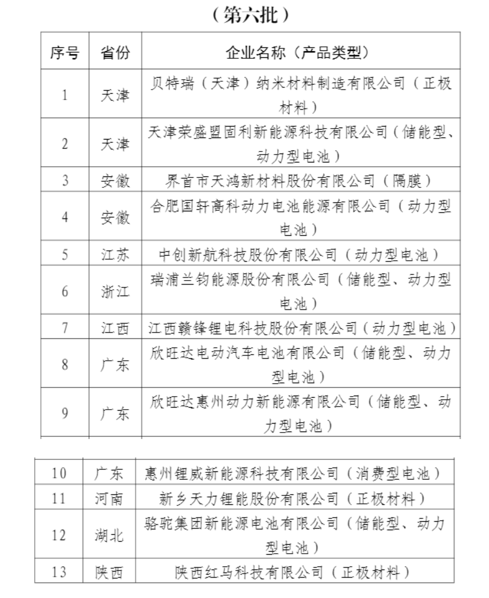公示文件显示,根据《锂离子电池行业规范条件(2021年本)》及《锂离子电池行业规范公告管理办法(2021年本)》的规定,经企业自愿申报、省级主管部门推荐、专家评审、现场核查等程序,工信部将拟公告符合《锂离子电池行业规范条件》企业名单(第六批)予以公示。企业名单中,贝特瑞(天津)纳米材料制造有限公司(正极材料)、合肥国轩高科动力电池能源有限公司(动力型电池)、新乡天力锂能股份有限公司(正极材料)、陕西红马科技有限公司(正极材料)、江西赣锋锂电科技股份有限公司(动力型电池)等13家企业在列。