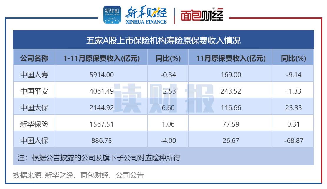 增速方面,5家机构呈现两极分化。中国太保11月份寿险原保费收入同比增速达23.33%,同期中国人保则同比下滑超60%。