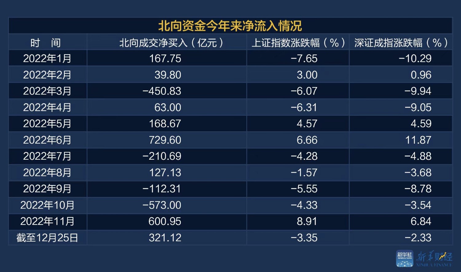 新华财经北京12月28日电(翟卓)2022年,全球资本市场剧烈波动,震荡调整亦伴随A股全年。据新华财经统计,北向资金年内累计净流入871.19亿元,较去年同期减少约3300亿元,降幅为79.13%(均为截至12月25日收盘数据,下同)。但从11月整体流向来看,北向资金全月大幅回流,单月净流入额超600亿元,加速净买入成为最新主旋律。由数据可窥探出外资机构11月以来积极布局中国资产,“聪明的钱”正加速流向中国。