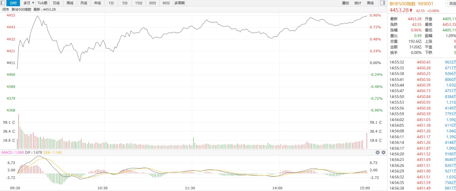 走势上看,新华500指数(989001)13日小幅低开后迅速冲高回落,期间涨幅一度逼近1%,随后指数开始稳步向上,并最终收于日内最高点附近。指数盘中最高触及4453.35点,最低触及4405.11点,成分股全天总成交额报3120亿元,较上一个交易日明显增加。