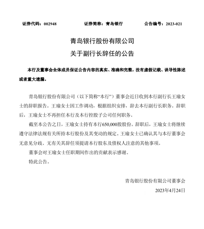 青岛银行公告,王瑜因工作调动,根据组织安排,辞去本行副行长职务。