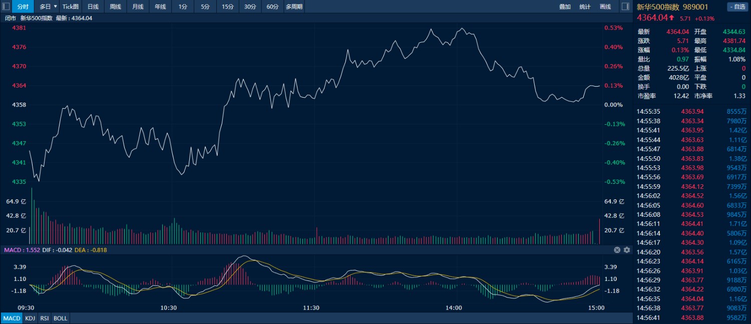 走势上看,新华500指数(989001)26日整体窄幅震荡,早间小幅低开后冲高未果,约10:30后重拾涨势,一路震荡向上最高涨超0.5%,约14:00后指数再度回落涨幅收窄。指数盘中最高触及4381.74点,最低触及4334.84点,成分股全天总成交额报4028亿元,较前一交易日小幅缩量。