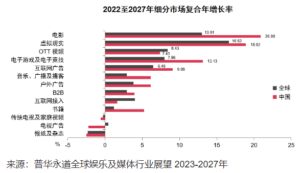 7月13日,普华永道在广州发布《2023至2027年全球娱乐及媒体行业展望》,报告预计中国娱乐及媒体行业至2027年收入将达约4,799亿美元,未来五年复合年增长率为6.1%,高于全球的3.5%。互联网广告、电子游戏与电子竞技是行业主要的增长驱动力,电影、虚拟现实(VR)等细分领域仍将保持较高增长。