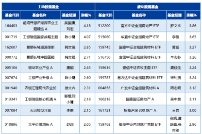 上周指数股基平均下跌2.00%,6%的产品上涨。其中,跟踪房地产、农业等相关指数的基金表现较好,南方中证全指房地产ETF、华夏中证全指房地产ETF、国泰中证全指建筑材料ETF分别上涨3.86%、3.65%、3.27%。