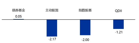 由于上周A股市场整体回调,主动股混基金全周下跌2.17%,指数股基下跌2.00%;债券基金上周上涨0.05%,QDII基金全周下跌1.21%。