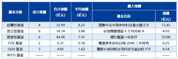 上周新成立基金21只,合计规模101.03亿元。其中混合型基金和债券型基金成立数量最多,共有12只产品成立。所有成立的产品中,首募规模最大的基金是博时富盈一年定开债券型基金,募集规模为20.00亿元。