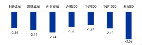 上证综指报收3167.75点,全周下跌2.16%,创业板指下跌2.74%,沪深300全周下跌1.98%,中证500全周下跌1.74%,科创50全周下跌3.63%。