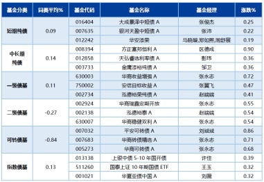 上周债券基金平均上涨0.05%,有86%的产品收益为正。分类来看,短期纯债基金平均上涨0.09%,中长期纯债基金平均上涨0.14%,一级债基平均上涨0.11%,二级债基平均下跌0.27%,可转债基平均下跌0.84%,指数债基平均上涨0.13%。