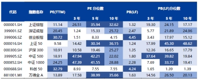 估值水平方面,上周主要市场指数整体估值有所下降。截至上周五,上证综指、沪深300、中证500、创业板指的PE(TTM)分别为11.14倍、10.91倍、18.91倍、30.72倍,处于近10年以来的32.62%、25.27%、22.02%、4.15%分位数水平。上证综指、沪深300、中证500、创业板指的PB(LF)分别为1.32倍、1.35倍、1.80倍、4.45倍, 处于近10年以来的17.17%、17.79%、19.84%、15.12%分位数水平。