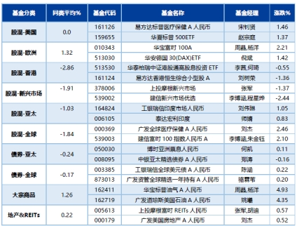 上周一至上周四,QDII基金平均下跌1.21%,26%的产品实现上涨。分类来看,股混QDII中,投资欧洲市场的股混QDII表现最佳,平均上涨1.32%,投资香港市场的表现较弱,平均下跌2.86%。债券QDII中,投资全球市场的债券QDII表现相对一般,平均下跌0.17%。投资大宗商品的QDII产品平均上涨1.26%。投资地产的QDII产品上周平均上涨0.22%。