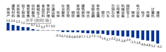 行业方面,上周行业多数下跌,申万一级31个行业中10个行业上涨。其中,房地产(3.6%)、建筑材料(2.6%)、农林牧渔(2.2%)等行业涨幅靠前;而通信(-6.2%)、计算机(-5.2%)、传媒(-4.8%)等行业跌幅靠前。