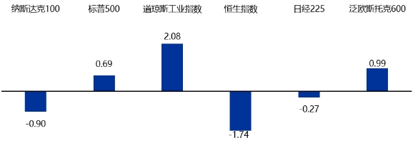 上周全球主要市场指数涨跌互现。其中,标普500、道琼斯工业指数分别上涨0.69%、2.08%,纳斯达克100指数下跌0.9%。其他主要海外市场中,泛欧斯托克600跟随美股上涨0.99%,日经指数下跌0.27%。港股方面,恒生指数全周下跌1.74%。