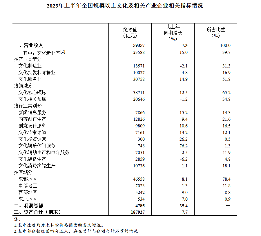 国家统计局:2023年上半年全国规模以上文化及相关产业企业营业收入增长7.3%