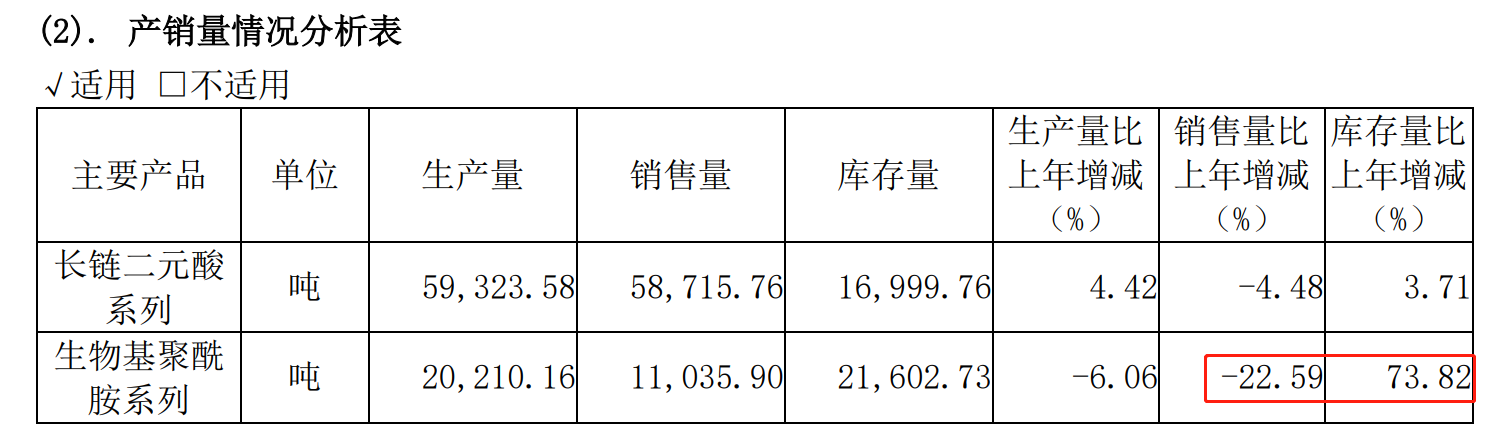 财报显示,今年上半年生物基聚酰胺系列销售收入6975.69万元,占比6.77%。2022年该产品销售收入为2.31亿元,同比下降21.57%;销售量同比减少22.59%,库存量同比增加73.82%。