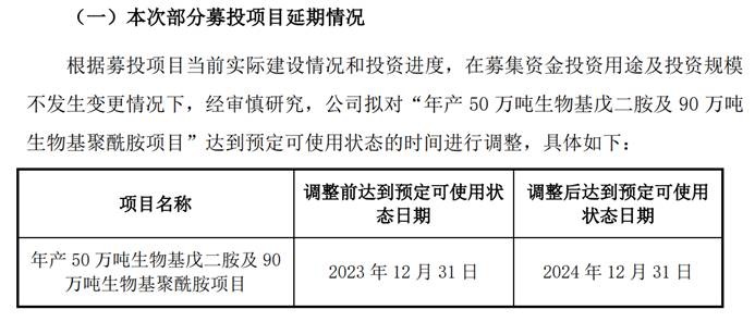凯赛生物在发布半年报的同时,还发布公告同意对募投项目“年产50万吨生物基戊二胺及90万吨生物基聚酰胺项目”进行延期,将该项目的达到预定可使用状态日期由今年底调整至了明年底。