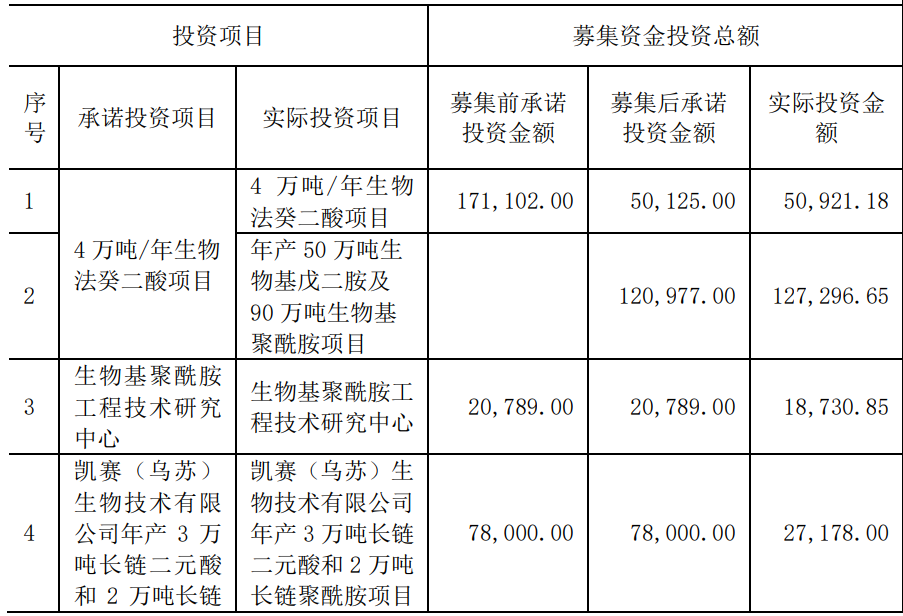 此前,凯赛生物公告了部分募资用途变更情况。其中包括将募投项目“4万吨/年生物法癸二酸项目”募集资金投入金额由约17亿元调整为约5亿元,变更募集资金约12亿元投入新项目“年产50万吨生物基戊二胺及90万吨生物基聚酰胺项目”。